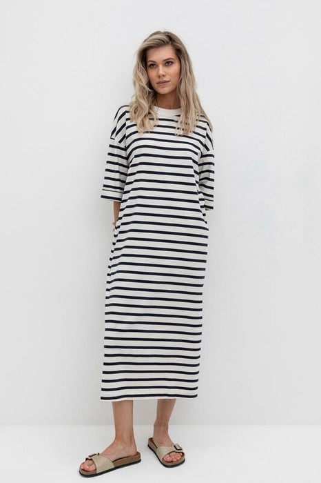 Трикотажное платье в полоску из длинноволокнистого гребенного хлопка. Спущенное плечо придает изделию свободный силуэт.