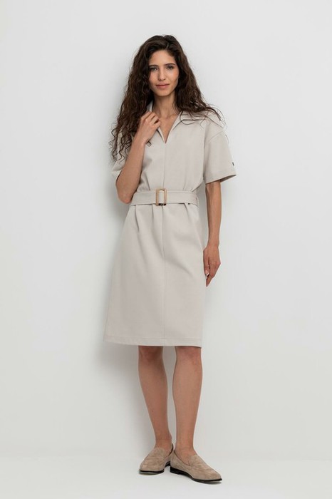 Платье поло с короткими рукавами из плотного гладкого трикотажа интерлок с V-образным вырезом и поясом. Спущенное плечо придает изделию свободный силуэт.
