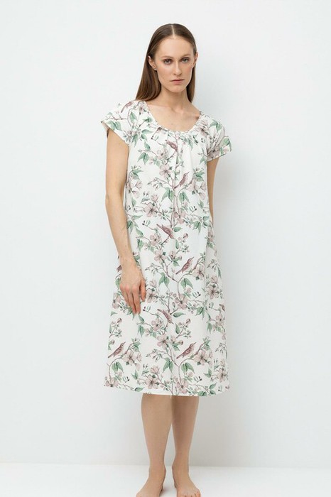 Уютная удлиненная сорочка с короткими рукавами из 100% натурального хлопка. Выполнена из набивного трикотажа супрем с нежным рисунком. Застроченные складки создают дополнительный объем.                                                                                     Все трикотажные полотна производятся в соответствии с нормами Швейцарского сертификата ЭкоТекс. Сделано в России
