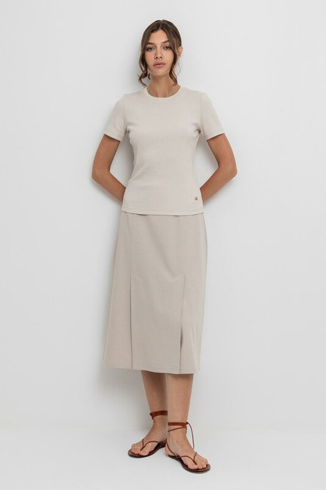 Юбка миди трапециевидной формы с отлетной деталью с разрезами из плотного гладкого трикотажа интерлок.