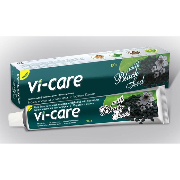 Зубная паста Vi-care with black seed укрепляет десна и зубы, предотвращает кариес, борется с бактериями, лечит воспаление и кровоточивость десен, сокращает образование зубного камня.