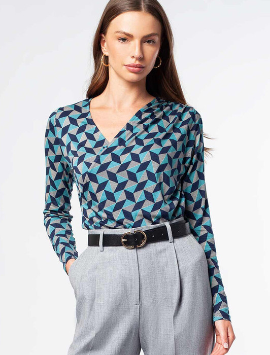 Блузка на запАх сшита из трикотажной вискозы с эластаном. Ассиметричный крой и геометрический принт, подчеркнут сборкой на левом плече. Мягкое полотно как вторая кожа, безупречно ложится по фигуре. Подчеркивает достоинства и скрывает неровности.