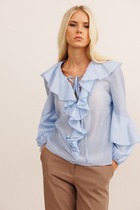 Блузка свободного силуэта выполнена из смесовой струящейся ткани. Модель в вертикальную полоску дополнена золотистыми рельефными пуговицами. Свободный силуэт подходит для любой фигуры. Для идеального роскошного образа используйте в качестве низа брюки светлых тонов. На спинке изделия фирменный металлический логотип бренда.