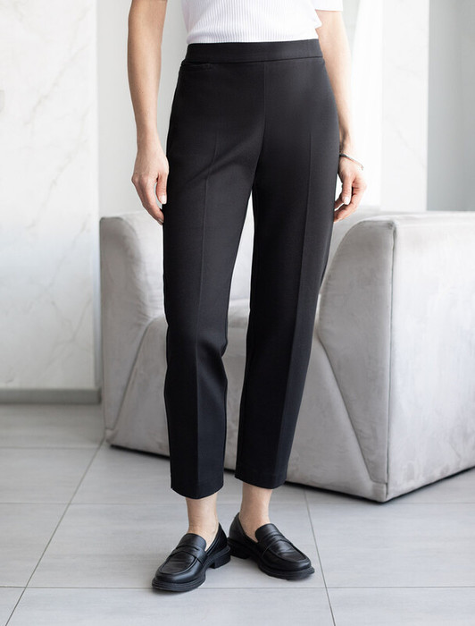 Брюки-дудочки выполнены из джерси. Модель дополнена резинкой сзади, одним вместительным карманом спереди и небольшими боковыми разрезами. Заутюженные стрелки и посадка на талии визуально вытягивают силуэт. Изделие хорошо держит форму, отлично тянется и почти не мнется во время использования. Идеальный вариант в офис или в повседневный классический стиль.