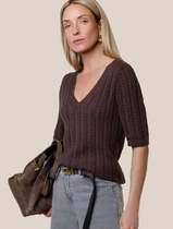Джемпер фактурной вязки выполнен из хлопка с добавлением кашемира. Модель с V-вырезом с вывязанным орнаментом цепи. Мягкая и очень приятная пряжа совершенно не колется, сохраняет тепло при этом не перегревая, гарантируя безупречный комфорт.