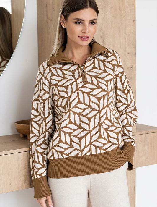 Джемпер с воротом на молнии жаккардовой вязки выполнен из нежной пряжи на основе вискозы с добавлением кашемира. Мягкая модель с серебристой фурнитурой не раздражает кожу, приятно ощущается на теле и поддерживает комфортный микроклимат. Совет стилиста: такой джемпер может стать ключевым акцентом в сдержанном комплекте. Выбирайте однотонные низы в тон рибаны или на контрасте.