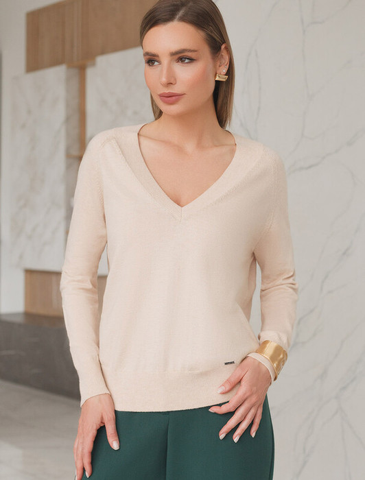 Джемпер тонкой вязки выполнен из хлопка с добавлением кашемира. Модель с V-вырезом свободного силуэта. Мягкая и очень приятная пряжа в рубчик совершенно не колется, сохраняет тепло при этом не перегревая, гарантируя безупречный комфорт.