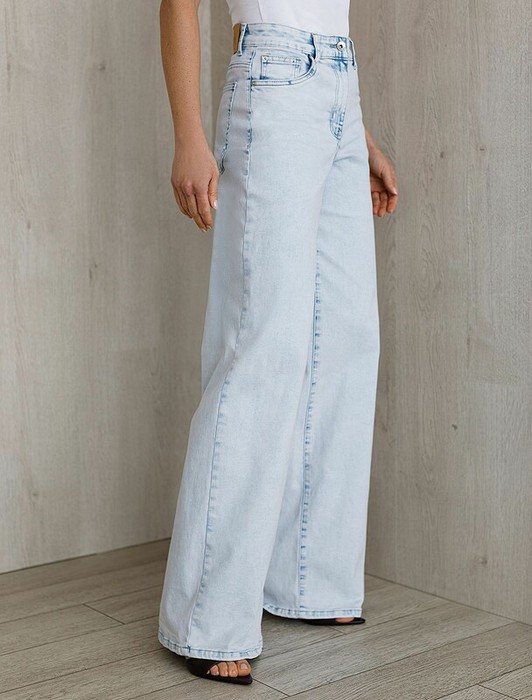Джинсы трубы светло-голубого цвета выполнены из эластичного денима плотностью 13,7 OZ - классическая структура, которая отлично держит форму.и подчеркивает фигуру. После пошива изделие подвергли специальному виду вошинга — salt-stone washing (солт-стоун вошинг), что дословно значит стирка с каменной солью. Такой вид вошинга позволяет получить стильные потертости на голубых оттенках денима. Джинсы прямого кроя визуально вытягивают силуэт, благодаря эластану в составе аккуратно садятся на любую фигуру и обеспечивают максимальный комфорт в течение дня, не сковывая движения. Широкая размерная линейка подходит для разных типов фигур: свободные джинсы комфортны как для обладательниц пышных форм, так и для худеньких. Плотные джинсы идеально держат форму даже при активном движении и не вытягиваются после долгой носки. Качественная фурнитура и нашивка из эко-кожи с логотипом бренда делают эти джинсы премиальными. Широкий крой добавляет актуальности — такие джинсы отлично сочетаются как с обувью на каблуке, так и на пл