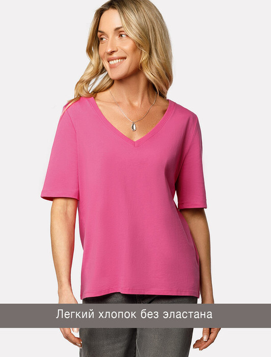 Совместные покупки Пермь Женская одежда Футболки — Vilatte Футболка из 100% хлопка с V-образным вырезом D49.091 розовая фуксия