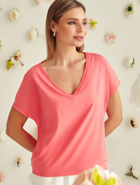 Футболка с цельнокроеным рукавом выполнена из премиального хлопка. Базовая однотонная модель идеально впишется в любой гардероб. V-вырез подчеркивает ключицы и удлиняет шею, хорошо сочетается с жакетами или кардиганами. Изделие дополнено металлическим логотипом бренда.