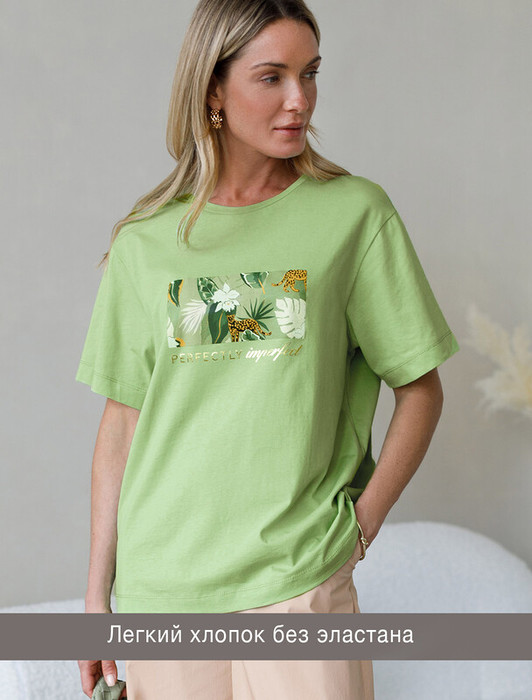 Совместные покупки Пермь Женская одежда Футболки — Vilatte Футболка из премиального хлопка с авторским принтом D49.089 фисташковый_