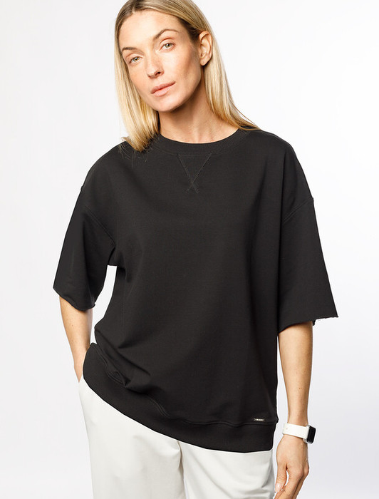 Футболка свободного кроя со спущенным плечом выполнена из футера двухнитки с эластаном. Лаконичный принт нанесен фактурной краской. Эластичный материал гарантирует комфорт и формоустойчивость. Сочетается в костюме с брюками D44.138, D44.139 и шортами D48.008. Изделие дополнено металлическим логотипом бренда.