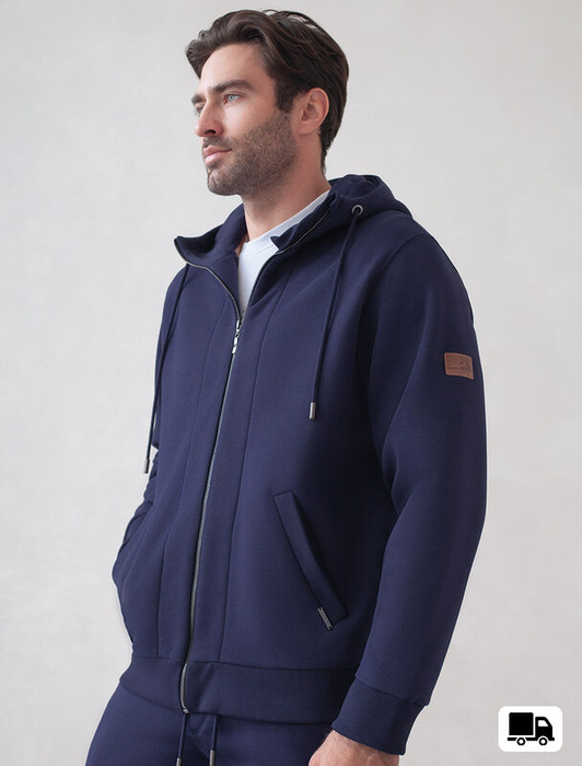 Худи на молнии выполнено из премиального эластичного футера трехнитки с теплым начесом. Модель с капюшоном и воротом стойка дополнена боковыми карманами и нашивкой с логотипом бренда из эко-кожи. Ранней осенью или поздней весной можно носить в качестве верхней одежды. Высококачественная фурнитура цвета темное серебро. Изделие сочетается в костюме с брюками U44.006