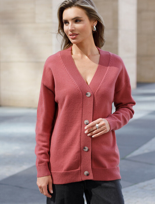Удлиненный кардиган выполнен из мягкой меланжевой пряжи с добавлением кашемира. Классическая модель с глубоким вырезом прямого силуэта идеально сочетается как с брюками, юбками, джинсами, так и с платьями. Застежка на пуговицы. Изделие очень приятное к телу, совершенно не колется и отлично сохраняет тепло. Сочетается в костюме с брюками D38.013, D38.012 и юбкой D36.016