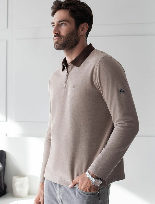 Поло хорошо садится по фигуре благодаря добавлению эластичных волокон — такой вариант подходит для мужчин любого роста и размеров, не стесняет движений и создает ощущение свободы и легкости. Лонгслив с молнией дополнен ненавязчивой вышивкой на груди в виде логотипа бренда в тон осн