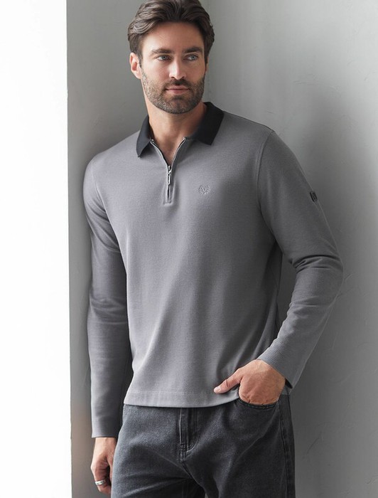 Стильный лонгслив темно-серого цвета с плетеным воротником поло с застежкой на молнию выполнен из премиального хлопка в сочетании с эластаном .Невероятно мягкая ткань из натуральных волокон - она едва ощутима на коже и словно обнимает тело. Материал при касании кажется бархатистым, при движении он словно повторяет все мельчайшие линии фигуры. По свойствам материал сочетает в себе практичность и нежность: отлично провускает воздух, сохраняя ощущение свежести в течение всего дня, при этом созраняет тепло в прохладную погоду.Идеально подходит для чувствительной кожи, не вызывает раздражения и дискомфорта. Удобный отложной воротник делает образ современным и стильным, а длинные рукава с манжетами защищают руки при ветреной погоде.