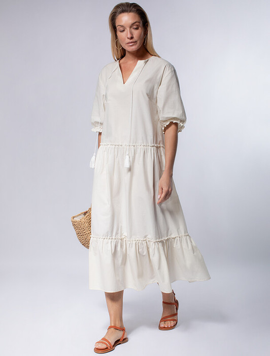 Платье с V-вырезом выполнено из легкого хлопкового поплина. Воздушная модель с пышной юбкой-воланами в стиле бохо отличный вариант для жаркой погоды. Натуральный состав ткани обладает высокой воздухопроницаемостью, а также способностью поглощать и отдавать влагу. В изделии будет очень комфортно, благодаря правильной регуляции температуры тела. Подходит для любой фигуры.