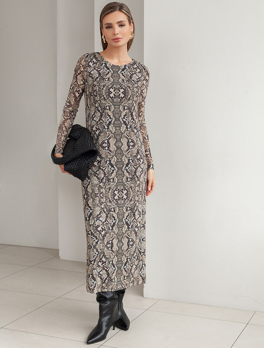 Элегантное платье прямого кроя черного цвета выполнено из воздушной сетчатой ткани с прозрачными рукавами, придающими образу лёгкую игривость. Мягкая вискозная подкладка обеспечивает комфорт, сохраняя при этом эффект полупрозрачности. Универсальный черный цвет делает платье идеальным для базового гардероба.
