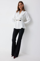 Трендовая модель для смелых fashion-образов. Эти брюки из качественной искусственной кожи создают бунтарский урбанистический лук. Модель с высокой посадкой на поясе и равномерно широким клешёным силуэтом от бедра до низа визуально вытягивает фигуру. Мягкая подкладка пояса обеспечивает комфорт, не сдавливая талию. Универсальный черный цвет легко комбинируется с объемными худи, кроп-топами или лаконичными рубашками. Идеальны для создания образов в стиле гранж, streetwear или modern rock-chic.