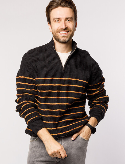 Свитер с узором полосы выполнен из хлопковой пряжи с добавлением акрила. Теплая модель фактурной крупной вязки с воротом, застегивается металлической молнией. Регулируя ворот можно носить с рубашками, футболками и водолазками. Кроме того, свитер совершенно не колется, поэтому его комфортно носить даже на голое тело. Внизу изделия нашивка бренда из эко-кожи.