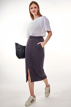 Юбка-миди трапециевидного силуэта выполнена из мягкого хлопкового микро-вельвета с добавлением эластана. Изделие комфортно садится по фигуре и не сковывает движения. Модель дополнена высококачественной фурнитурой с фирменным логотипом бренда. Хорошо комбинируется с вязаным трикотажем, блузками и денимом.Также прекрасно станет альтернативой деловым низам в нестрогом офисном дресс-коде.