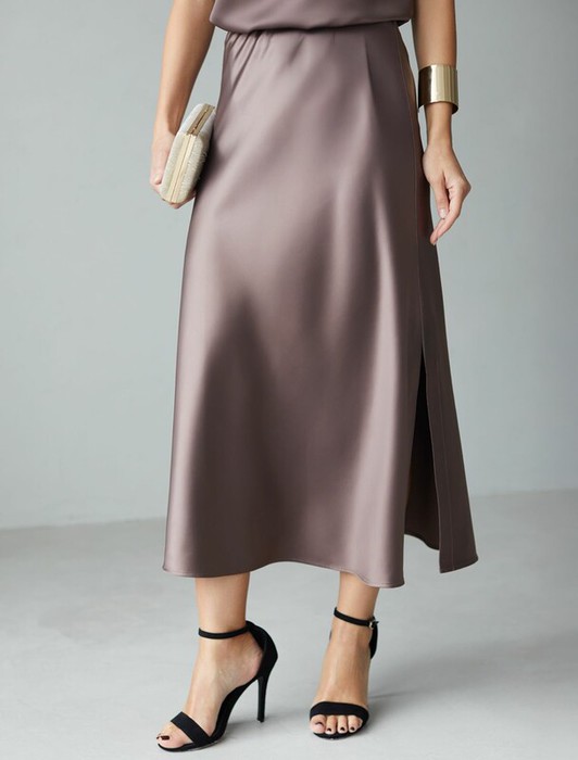 Vilatte Юбка миди с разрезом из струящегося плотного сатина D26.205 кофейный