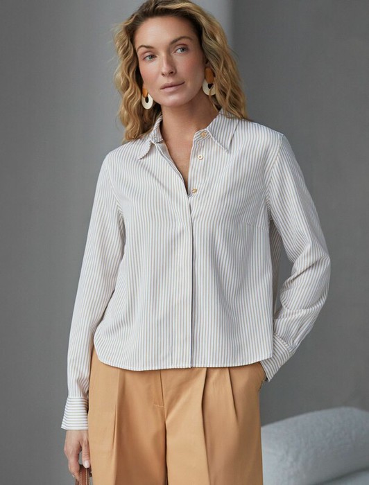 Совместные покупки Пермь Женская одежда Блузки, рубашки — Vilatte Укороченная блузка из эластичного хлопка D29.322 белый-бежевый