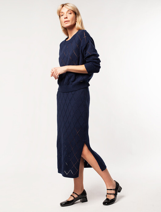 Юбка прямого силуэта выполнена узорной вязкой из мягкой хлопковой пряжи. Тонкий ажурный трикотаж идеально подходит для теплой весны и лета, в нем будет комфортно и не жарко. Модель дополнена разрезом на ноге и подкладкой из трикотажного полиэстера, такой материал гарантирует формоустойчивость юбки и скрывает излишнюю прозрачность. Сочетается в костюме с джемпером D33.007 и D39.629