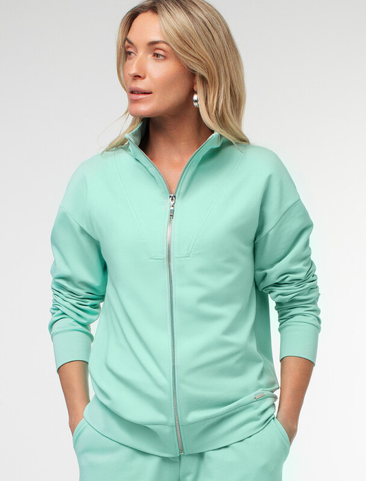 Жакет выполнен из футера двухнитки с эластаном. Модель без карманов с воротом стойка и застежкой на молнию серебристого цвета. Эластичный материал гарантирует комфорт и формоустойчивость. Сочетается в костюме с брюками D44.138, D44.139 и шортами D48.008. Изделие дополнено металлическим логотипом бренда.