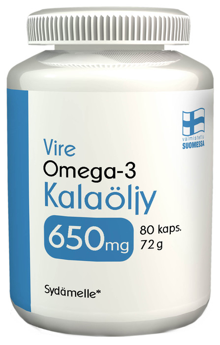 Жирная кислота омега-3 действует как антагонист омега-6. Vire Омега-3 жирные кислоты EPA и DHA в рыбьем жире поддерживают нормальную работу сердца. Положительный эффект достигается при потреблении 250 мг жирных кислот EPA и DHA в день. Капсула с рыбьим жиром, содержащая омега-3 жирные кислоты, для здоровья сердца, разработана и произведена в Финляндии. Ингредиенты: концентрат рыбьего жира (происхождение: не из ЕС), желатин (крупный рогатый скот), увлажнитель (глицерин), вода, DL-альфа-токоферилацетат (E vit., Происхождение: не из ЕС). Рыбий жир получают из жирной рыбы Тихого океана, такой как сардины, анчоусы и скумбрия. Дозировка: 2 капсулы в день. Не рекомендуется людям с нарушением свертываемости крови. Хранить в недоступном для маленьких детей месте. 1-2 капсулы содержат: Рыбий жир / 650-1300 мг / Омега-3 жирные кислоты / 460-920 мг жирных кислот EPA / 230-460 мг жирных кислот DHA / 170-340 мг витамина E /5-10 мг ТЕ (83% *). Рекомендуемая суточная доза не должна быть превышена. Пищевая добавка не заменяет разнообразное и сбалансированное питание или здоровый образ жизни. Храните в недоступном для детей месте. Страна производитель: Финляндия.