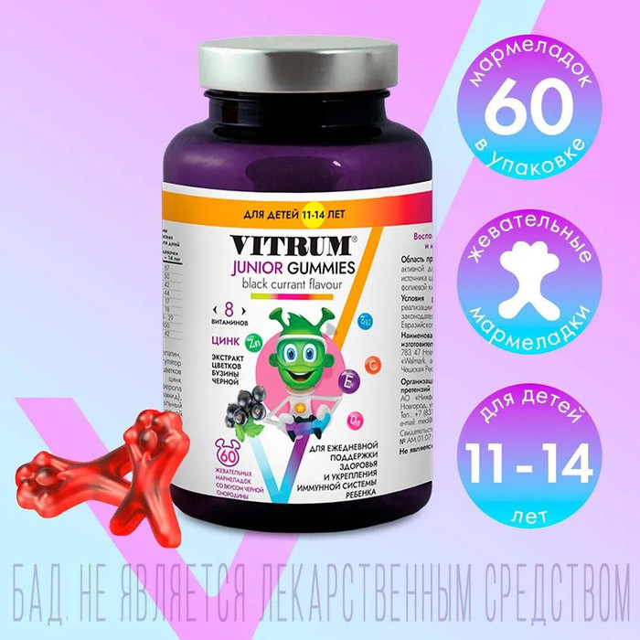 Витрум Юниор, мармеладки со вкусом черной смородины, 60 шт - витаминно-минеральный комплекс для детей 11-14 лет, содержит 8 витаминов, цинк и экстракт цветков бузины черной для ежедневной поддержки иммунитета ребенка. Комплекс предназанчен для восполнения недостатка витаминов и минералов у детей 4-11 лет.