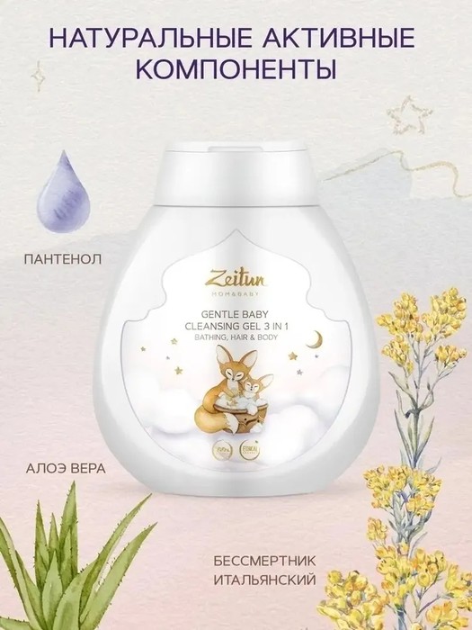 Нежный очищающий гель 3-в-1 Zeitun Mom&Baby с нейтральным рН бережно очищает волосы, сухую и чувствительную кожу, помогает нейтрализовать ее чувствительность, особенно в жесткой воде, и мягко удалить корочки на голове новорожденного.