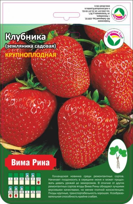 Ягоды Вима Рины крупные, округло-конические, вытянутые, с хорошо выраженной шейкой. По внешнему виду: насыщенно-красного цвета с привлекательной глянцевой поверхностью. Мякоть плотная, сочная, нежной консистенции. Вкус насыщенный, с легкой кислинкой. По вкусовым качествам является одним из лучших сортов ремонтантной группы.