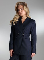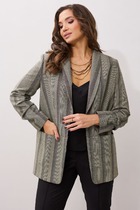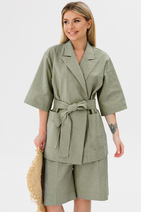 Жакет женский свободного силуэта со спущенным плечом. Рукав короткий. По переду накладные карманы. Жакет без подкладки, с поясом из основной ткани.