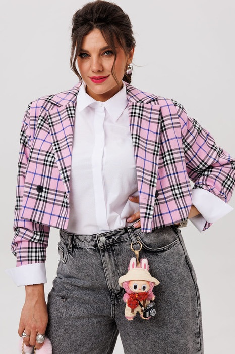 Этот укороченный двубортный жакет, словно созданный для тех, кто ценит баланс между классикой и современностью, идеально подчеркивает силуэт, добавляя образу лёгкую дерзость и безупречный стиль. Выполненный из благородной костюмной ткани в изысканную клетку, он сочетает в себе строгость кроя и игривость актуальных оттенков.