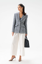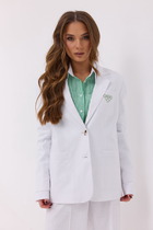 Жакет прилегающего силуэта выполнен из фактурной ткани. Характеристики: прилегающий силуэт, однобортный, подплечники, подкладка, отложной воротник с лацканом, застежка центральная на петлю пуговичку, рукав втачной, по низу рукава пуговички, пуговички в изделии декорированы тканью основного изделия, по переду прорезные карманы с клапаном. Длина по спинке 69 см, длина рукава 64 см.