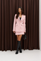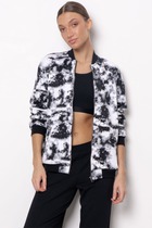 Жакет прямого свободного кроя выполнен из костюмной ткани с геометрическим принтом. Характеристики: прямой крой, однобортный, подкладка, подплечники, отложной воротник с остроугольным лацканом, застежка центральная на петли пуговицы, по переду функциональные карманы с клапаном, рукав втачной, по низу рукава нашиты пуговички, в среднем шве заднего полотна изделия разрез 24 см. Длина по спинке 77 см, длина рукава 62 см.