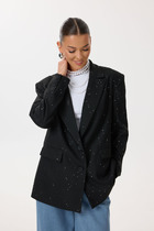 Жакет прямого кроя. Выполнен из трикотажного полотна. Есть подкладка. Воротник рубашечного типа. Рукав втачной, спущенный, с манжетой. Застёжка центральная потайная молния. По переду накладные карманы с клапаном. Шлёвки, пояс из ткани основного изделия. Длина рукава от линии втачивания 60 см. Длина спинки 72 см
