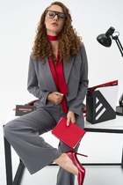 Жакет двубортный, полуприталленого силуэта. Выполнен из костюмной ткани белого цвета в полоску. Характеристика: отложной воротник с остроугольными геометрическими лацканами, вточной рукав, подклад, подплечники, талиевые выточки по переду, отрезной бочок, по переду изделия карманы-листочки талиевые вытачки по спинке. Длина рукава 24 см. Длина спинки от края горловины 72 см.