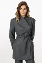 Жакет прямого свободного кроя. Выполнен из костюмной ткани синего цвета с полоской голубого цвета. С подкладкой. Воротник отложной, с лацканами. Рукав втачной, немного спущен. Есть подплечники. По переду карманы с клапаном (функциональные). В среднем шве заднего полотна высокая шлица (48 см). Застёжка центральная пуговицы. Длина спинки 76 см. Длина рукава от линии втачиваня 61 см. В комплекте пояс из основной ткани