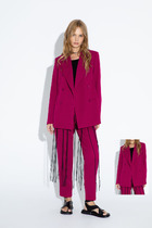Жакет прямого кроя выполнен из эко-кожи бежевого цвета. Характеристики: прямой крой, брендированная покладка, подплечники, отложной воротник с остроугольным лацканом, застежка центральная на петли пуговицы, по линии талии шлевки, в комплекте пояс из ткани основного изделия, рукав втачной. По линии плеча погон с пуговицей, в среднем шве заднего полотна изделия шлица 17 см. В боковых швах изделия карманы. Длина по спинке 65 см, длина рукава 58 см.
