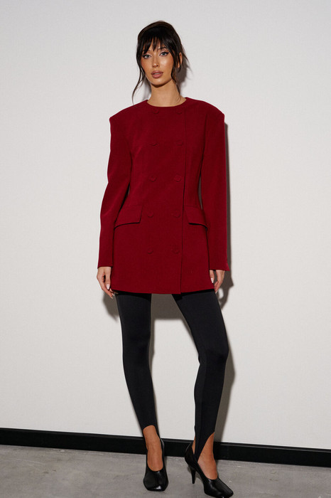 Жакет полуприталенного силуэта выполнен из костюмной ткани бордового цвета. Характеристики: полуприталенный силуэт, двубортный, брендированная подкладка, подплечники, овальный вырез горловины, по переду функциональные карманы с клапаном, рукав втачной, по низу рукава нашиты пуговички. Длина по спинке 77, длина рукава от края горловины 75 см.