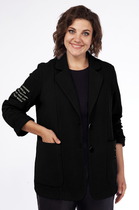 Жакет укороченный полуприталенного силуэта, выполнен из текстильной, чуть ворсистой ткани, серого цвета в узкую полоску. Характеристика: полуприталенный силуэт, вороник-стойка, центральная застежка на пуговицы слегка на запах, слева на груди имитация прорези для кармана, чуть ниже талии имиьация карманов с клапанами, подплечники, рукав втачной с небольшим разрезом застегивающимся на пуковицы, по переду и сзади изедлия простроченные выточки, спинка с центральным швом. длина рукава от шва втачивания 64см. Длина изделия по центру спинки 54см.