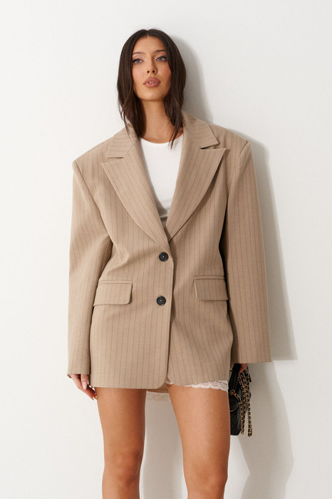 Жакет прямого кроя, выполнен из костюмной ткани песочного цвета в узку полоску. Характеристика: прямой свободный крой, воротник с остроугольным лацканом, застежка центральная на пуговицы, брендированный подклад, спереди прорези для функцинальных карманов с клапанами, плечо спушенное, рукав свободный, с декоративными пуговицами, в центральном шве по спинке разрез 25 см. Длина плеча 19 см, длина рукава от места втачивания 64см. Длина изделия по центральному шву по спинке 76 см.