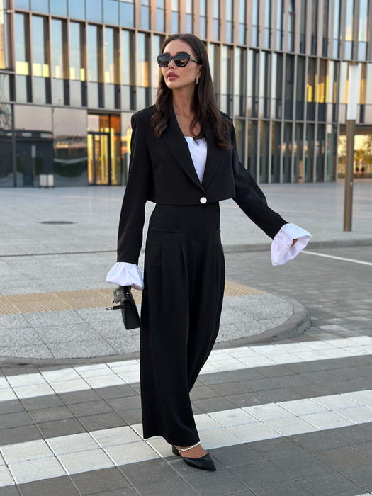 Однобортный жакет на подкладке, свободного силуэта. Рукава втачные одношовные, обработаны шлицей. Рукава обработаны съёмными деталями из атласной ткани.