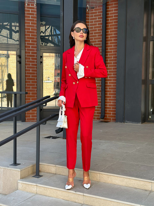 Двубортный жакет на подкладке, прямого силуэта. Обработаны прорезные карманы по переду. Рукава втачные одношовные, обработаны шлицей