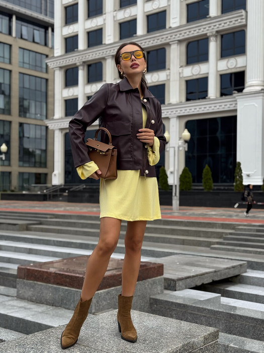 Жакет однобортный,  на подкладке, выполнен из эко-кожи. Обработан молнией разъёмной молнией по центру переда, закрывающейся планкой с пуговицами. Воротник тложнй, рубашечного типа. Рукава втачные одношвные, прямые. По  передним половинкам обрабтаны накладные карманы с клапаном.