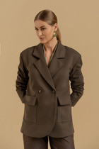 Жакет однобортный, на подкладке, обработаны защипы на линии талии. Воротник костюмный, рукав втачной, прямой, лдношовный, обаботан шлицей. Фурнитура - пуговицы золотистого цвета
