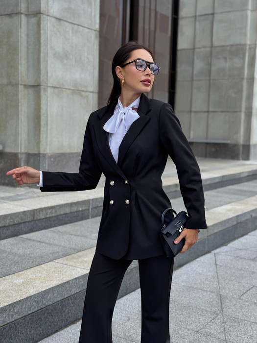 Жакет однобортный, на подкладке, обработаны защипы на линии талии. Воротник костюмный, рукав втачной, прямой, лдношовный, обаботан шлицей. Фурнитура - пуговицы золотистого цвета