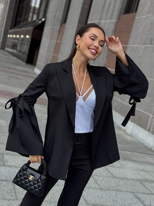 Жакет однобортный свободнго силуэта. Жакет обработан подкладкой. Рукав прямой, длинный, втачной, отрезной с пришитой присборенной деталью, шнурком из основной ткани для завязывания.